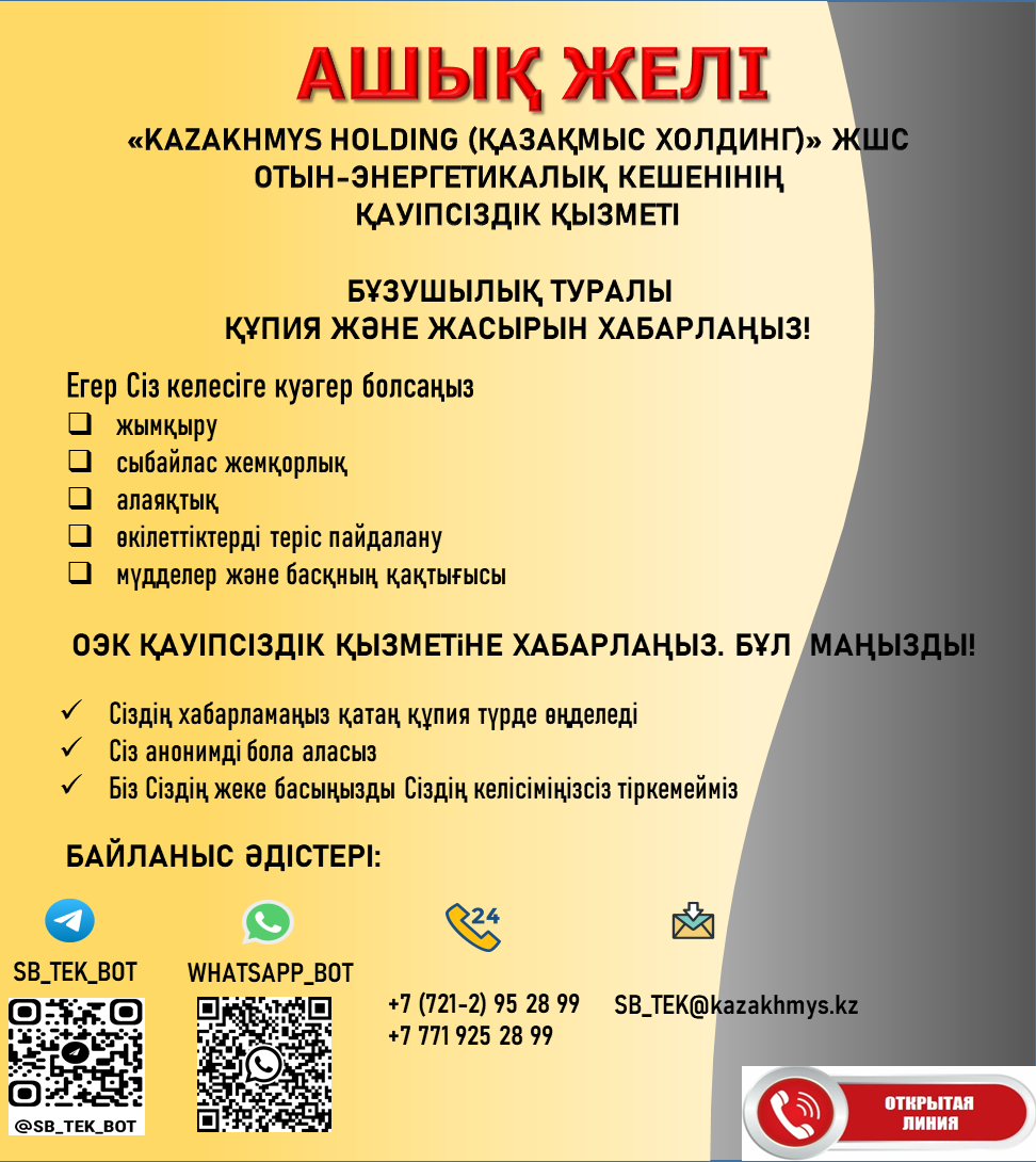 Құрметті сайт қонақтары! «Kazakhmys Holding (Қазахмыс Холдинг)» ЖШС-нің Отын-энергетикалық кешеніне кіретін компанияларда «Қауіпсіздік қызметінің Ашық желісі» іске қосылғаны туралы Сіздерге ресми түрде хабарлаймыз.